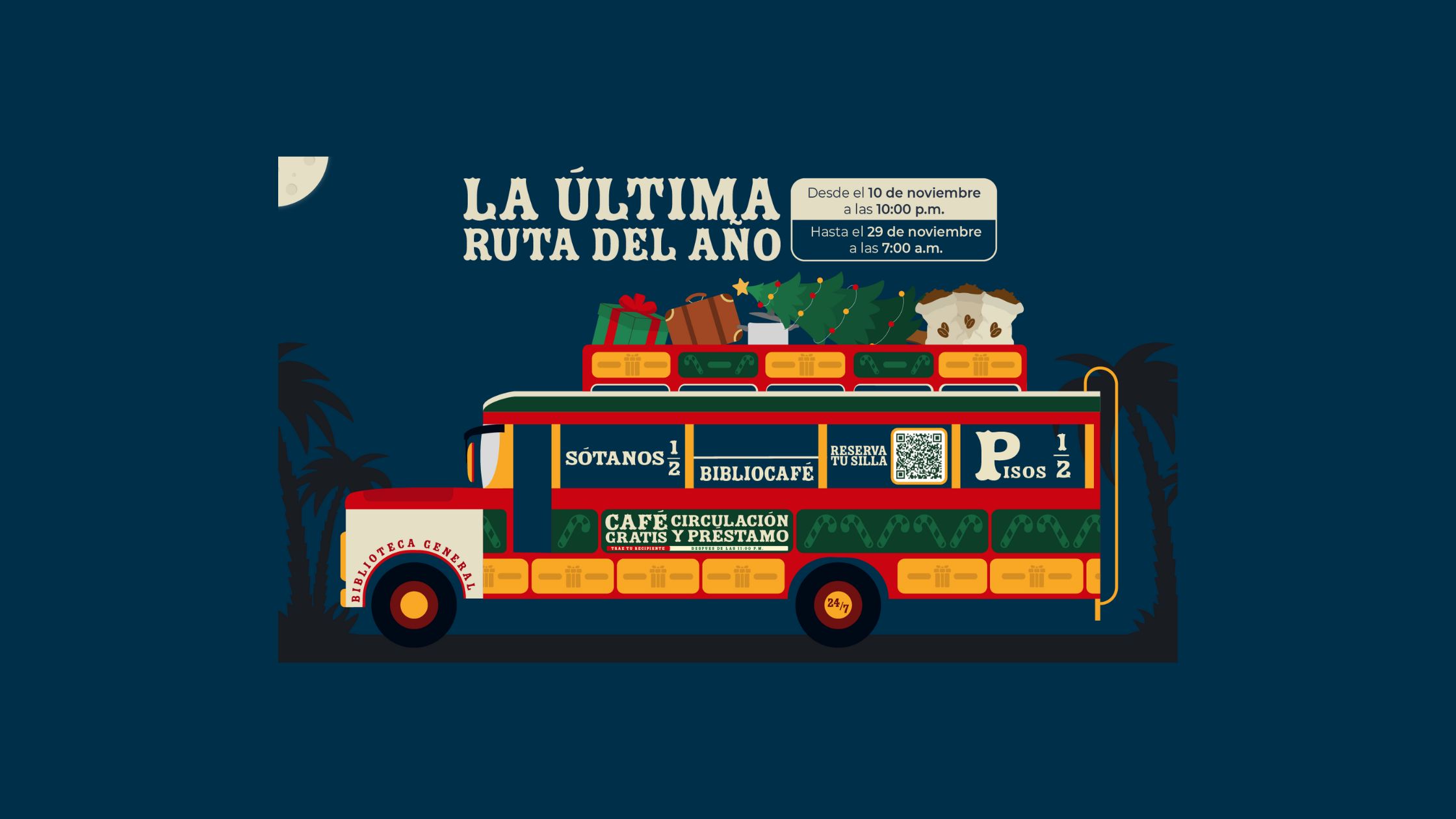 Biblioteca General: Lunes a viernes de 6:00 a.m. a 10:00 p.m. Sábados de 7:00 a.m. a 7:00 p.m. Domingos y festivos de 8:00 a.m. a 12:00 p.m.